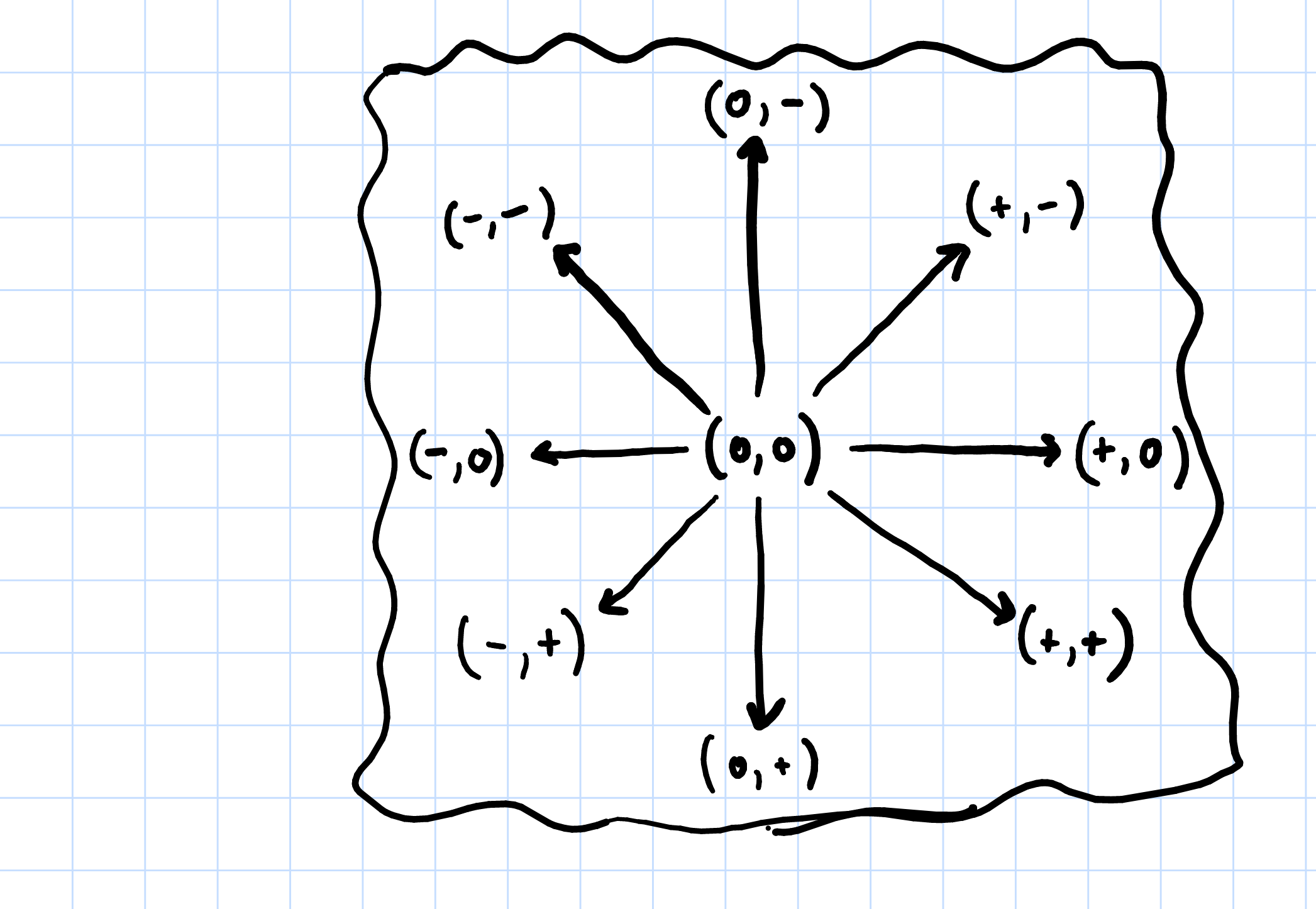 Before we get to the code, let’s talk about velocity and movement. Velocity represents how far you will travel in a certain amount of time, i.e. miles per hour. For our purposes, we want to know how many pixels the player will move in one frame of the game, or pixels/frame. We can use velocity to represent direction by incorporating a sign. Pixel coordinates go up as we go right, so a positive velocity means moving right and a negative means moving left. To take care of the y coordinate we just add a second velocity variable. In this case positive means moving down the screen and negative means moving up. So, with two numbers, the velocity in the x direction and the velocity in the y direction, we can represent and determine player direction based on the sign (positive, negative, or zero) of the velocity values as follows: