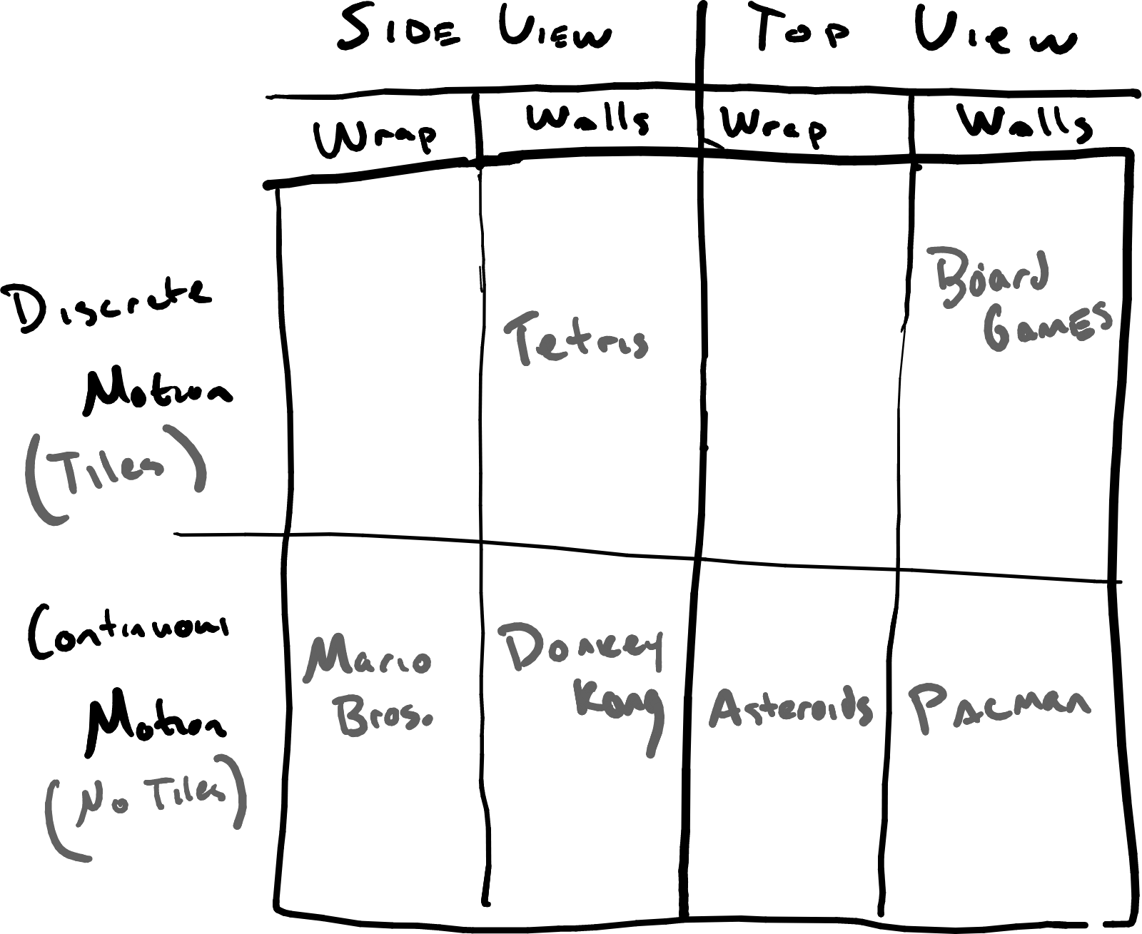 All the aforementioned classic games can be fit into one of these design boxes: